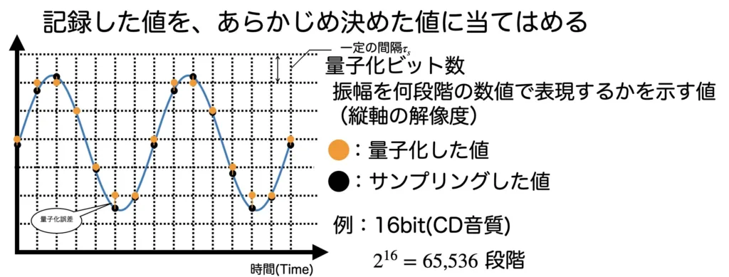 振幅を何段階の数値で表現するかを示す値を量子化ビット数といいます。これが縦軸の解像度を決めます。あらかじめ決めた値に当てはめるため、どうしても元の値との間に僅かなズレが生じます。これを量子化誤差と言います。