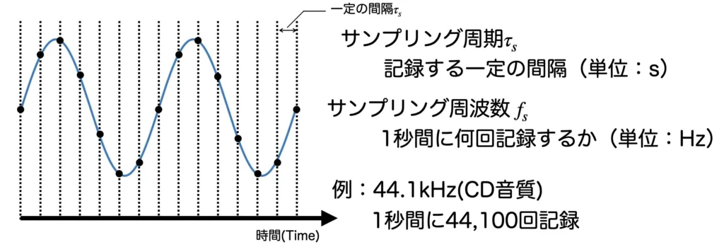 一般的には、周期ではなく、1秒間に何個のサンプリングができるかを意味する、サンプリング周波数\(f_s = 1/\tau_s\)の方が使われます。CD音質だと一般的には44.1kHzが使用されます。