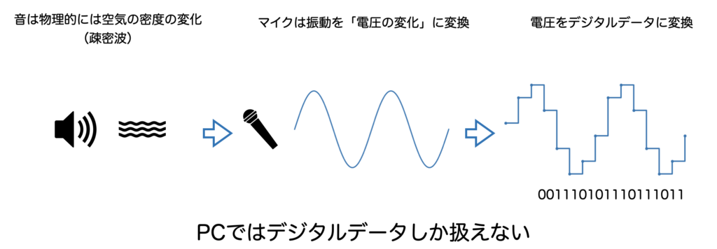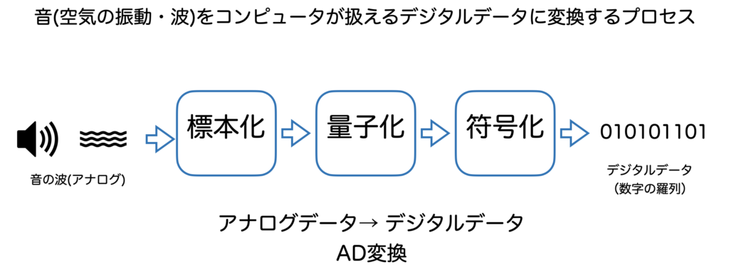 音信号を例に考えてみると、音というのは物理的な空気の密度の変化(振動)です。これ振動をマイクでは電圧の変化として捉えます。ここまでは、切れ目のない滑らかなアナログデータですが、これではコンピュータでは扱うことはできません。そのためコンピュータで扱うためには、アナログデータをデジタルデータに変換する必要があります。このような変換プロセスをAD変換(Analog-to-Digital Conversion)といいます。