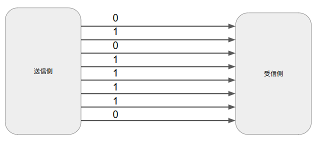複数の信号線を使って、一度に複数のビット(例えば8ビットや16ビット)をまとめて送る方式です。多車線の高速道路に例えられます。一度に大量のデータを送れるためかつては主流でしたが、配線数が多くなり基板の面積を圧迫することや、高速化すると複数の配線間で信号が到達するタイミングのズレ(スキュー)が発生しやすくなるという弱点があります。