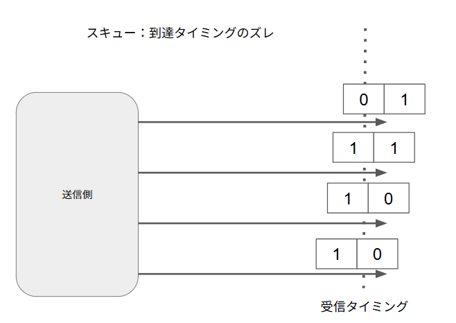 スキューとは、以下の図のように複数の信号線の間で、信号が受信側に到達するタイミングのズレのことです。基板上の配線の長さの微小な違いや電気的な影響により受信側に到達する時間に差が生じます。通信速度が高速になると、このズレが致命的となって、受信側が正しく読み取れなくなります。以下の図のように、送信側は0111を送信したつもりでも、若干ずれがあり、受信側では0110となってしまいます。