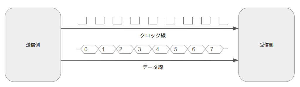 送信側と受信側の間で、データ線とは別に「クロック専用の信号線」を接続する方式です。マスターが規則正しいクロック信号を出力し、そのクロックの立ち上がり、あるいは立ち下がりのタイミングに完全に同調してデータを読み書きします。