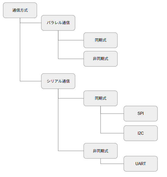 デバイス同士でなにかデータをやり取りして、通信する方式は、大きく以下のように分類されます。シリアル通信・パラレル通信、さらに同期式・非同期式と分かれています。現在の通信プロトコルはシリアル通信が主流となっています。