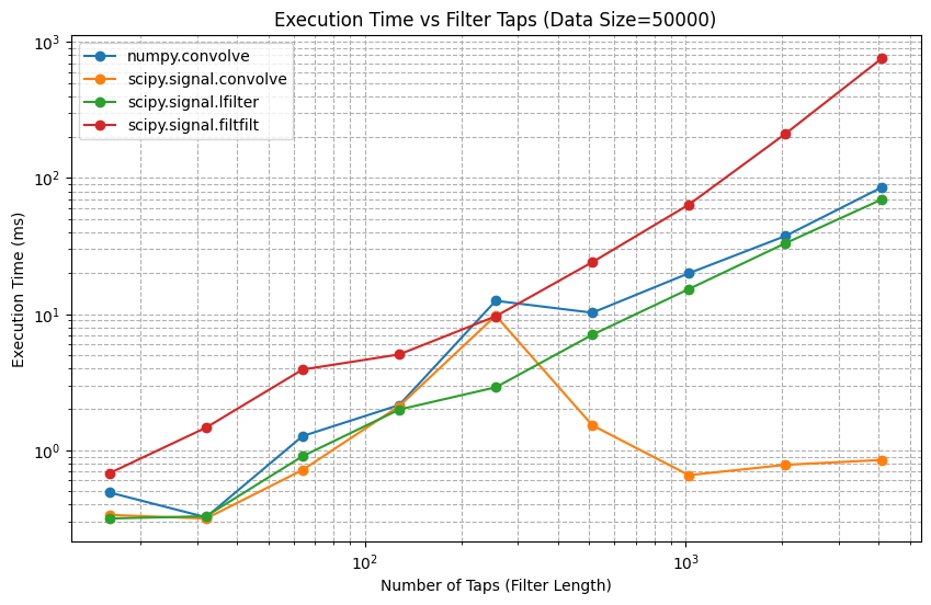 この結果を見ると、先ほどと同様にfiltfiltが一番時間がかかっていることがわかります。一方で、scipy.signal.convolveに関して、タップ長をある程度伸ばしたタイミングで急に実行時間が減っていることがわかります。