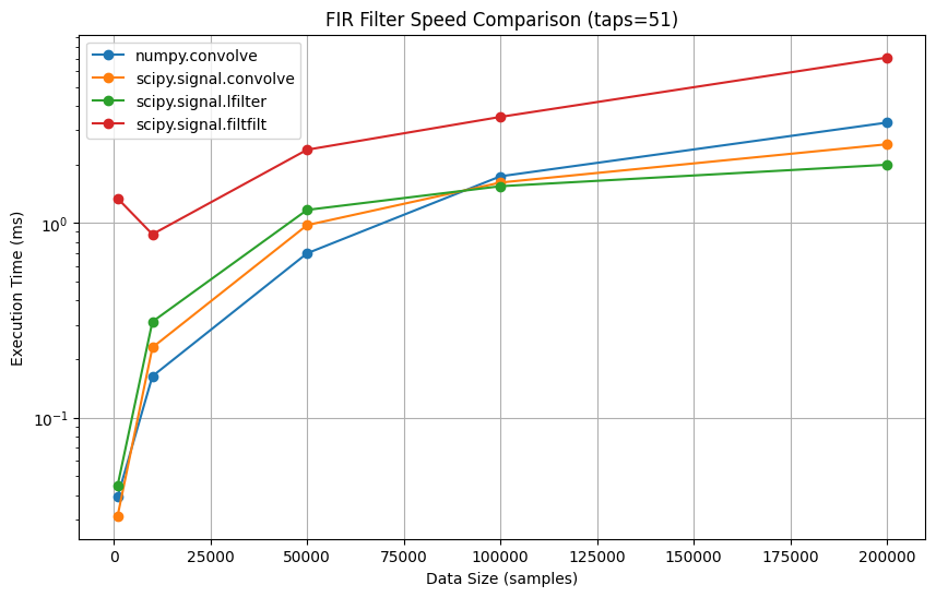 PythonでFIRフィルタを実装する場合、オフライン解析かリアルタイム処理か、信号の長さやタップ長の長さによって最適なメソッドが異なります。それぞれの特徴と実装パターンを整理しました。