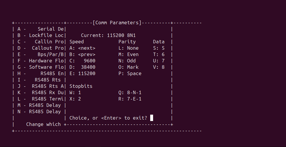 ボードレートは送受信で合わせておく必要があるので、設定します。Eを押して、Bps/Par/Bitsを修正します。ここで、115200 8N1となっていますが、この意味は以下のようになっています。